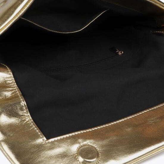 Elegante cartera de mano con efecto piel metalizada y logo LC ovalado. Diseño acolchado para mayor comodidad. Cuenta con cierre magnético y bolsillo interno. Ideal para complementar tu look con un toque de brillo y sofisticación.