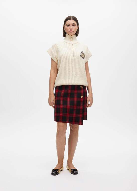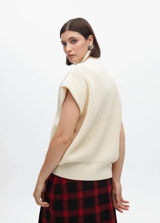 Chaleco de punto grueso en color crema, decorado con cremallera dorada al frente. Presenta un cuello alto y un elegante escudo bordado. Diseño sin mangas con ajuste relajado, perfecto para capas en días más fríos, ofreciendo comodidad y estilo.