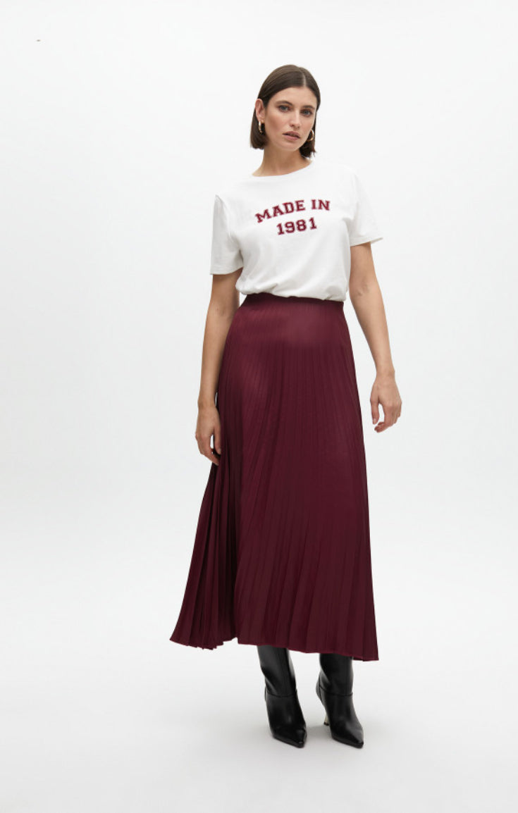 Falda plisada larga con un elegante efecto encerado. Confeccionada en tejido suave para un acabado fluido. Detalle de cintura con ajuste ultrasuave y cierre lateral oculto. Un básico sofisticado que se adapta con estilo a diferentes ocasiones.