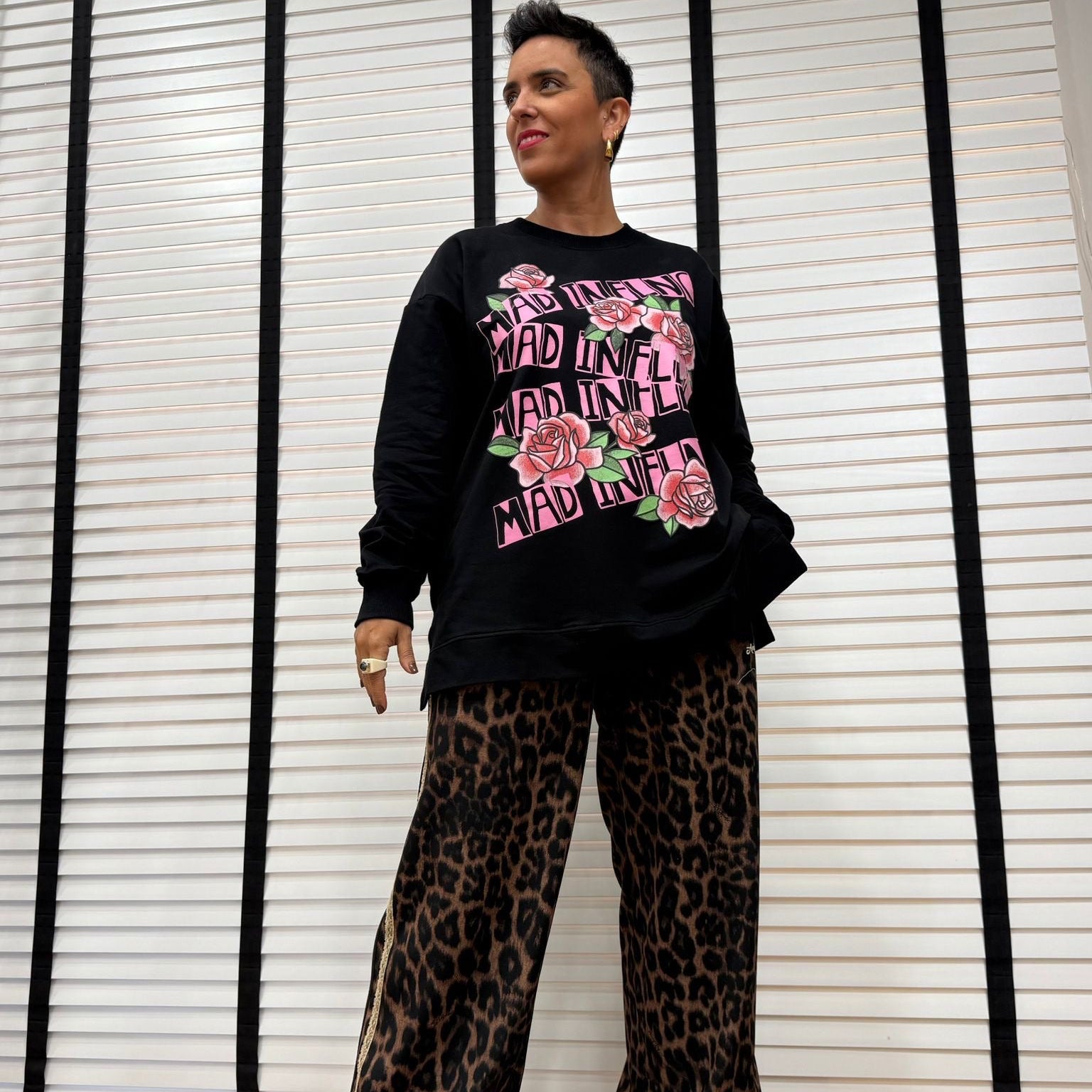 Sudadera larga negra, con aberturas laterales y estampado rosas