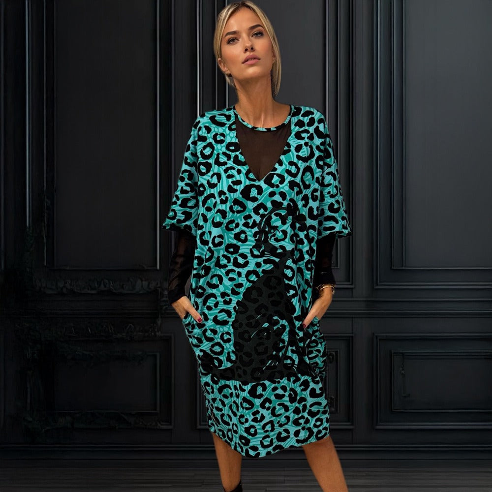 Color El vestido está disponible en un color leopardo Tiffany que combina verde, azul y negro.