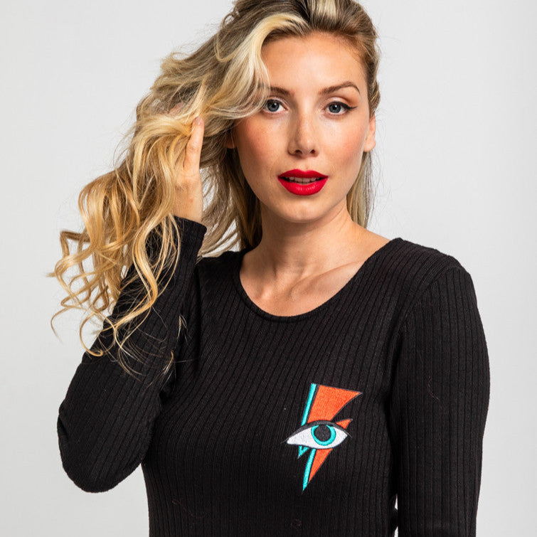 Vestido Mini Vuelo Canalé Negro Con Rayo Y Ojo - Let's Dance